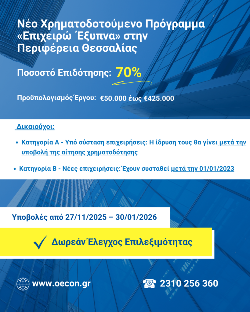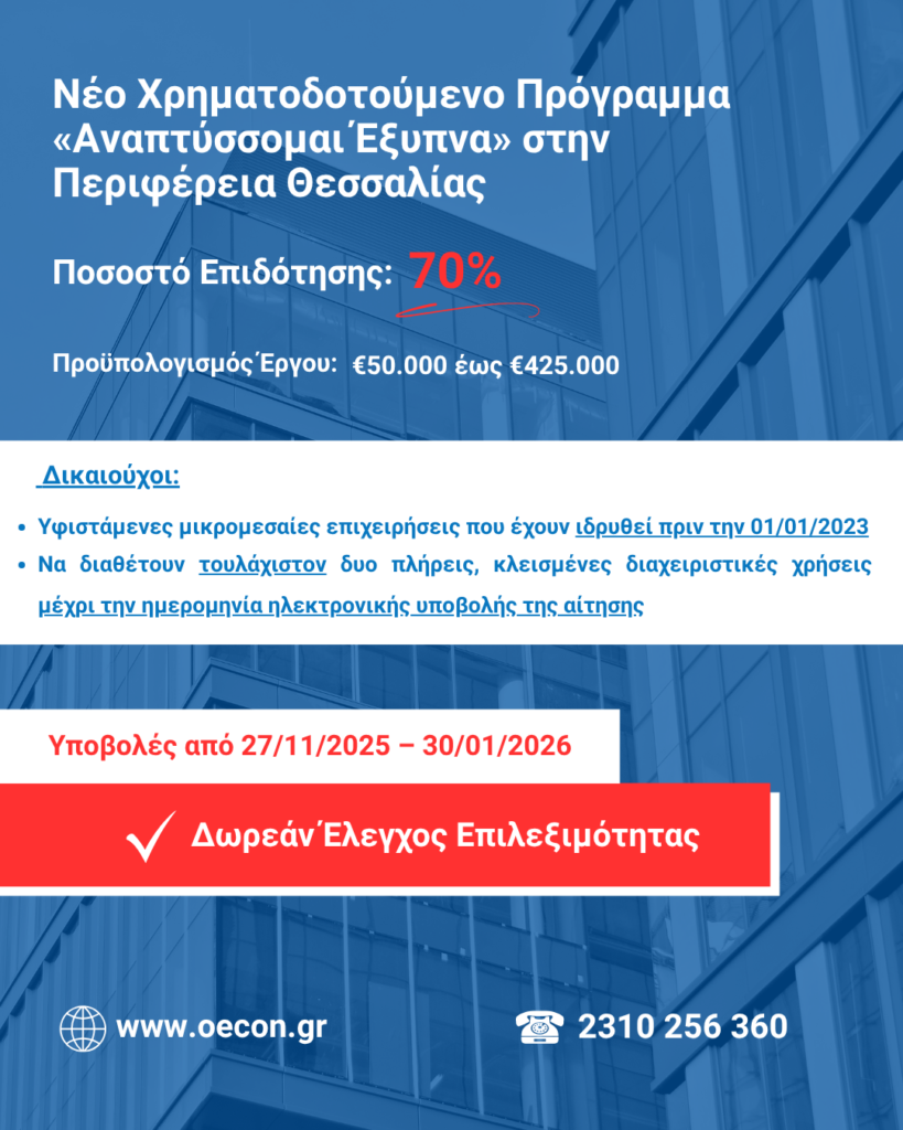 Προϋπολογισμός έργου:• €50.000 – €425.000• Ποσοστό ενίσχυσης: 70%• Διάρκεια υλοποίησης: […]