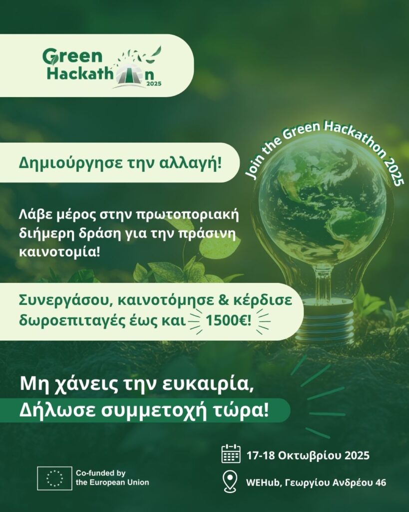 Το Green Hackathon 2025 φιλοδοξεί να αποτελέσει σημείο συνάντησης νέων, εκπαιδευτικών, επιχειρηματιών και φορέων που επιθυμούν να συμβάλουν ενεργά στη βιώσιμη ανάπτυξη.
