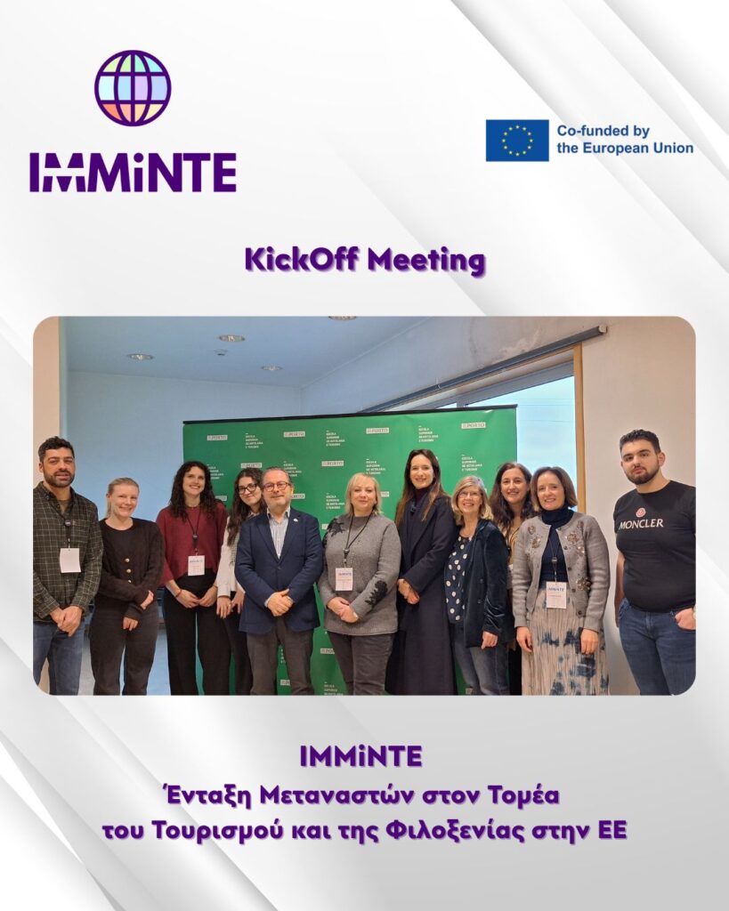 Με επιτυχία πραγματοποιήθηκε η 1η συνάντηση (Kick-off Meeting) του ευρωπαϊκού έργου IMMiNTE – Ένταξη Μεταναστών στον Τομέα του Τουρισμού και της Φιλοξενίας στην ΕΕ, σηματοδοτώντας την επίσημη έναρξη μιας δυναμικής συνεργασίας με κοινό όραμα την ενίσχυση της απασχολησιμότητας και της κοινωνικής ένταξης.