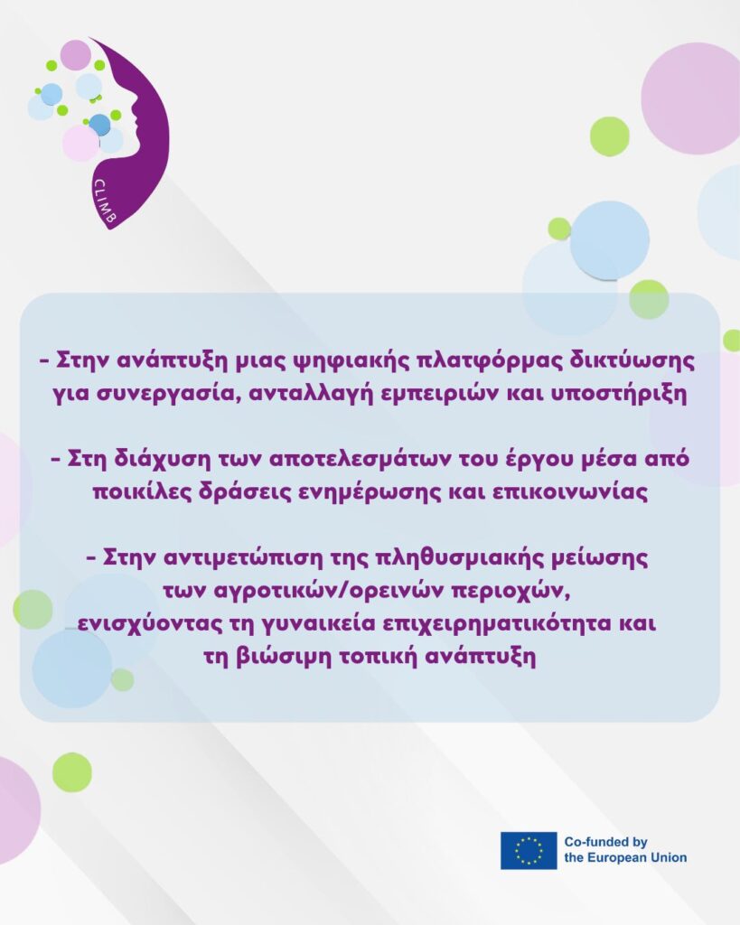 Το έργο CLIMB έχει ως βασικό στόχο την ενδυνάμωση των γυναικών σε αγροτικές και ορεινές περιοχές, δίνοντάς τους τα εργαλεία και τις ευκαιρίες να αναπτύξουν τη δική τους επιχειρηματική δραστηριότητα.